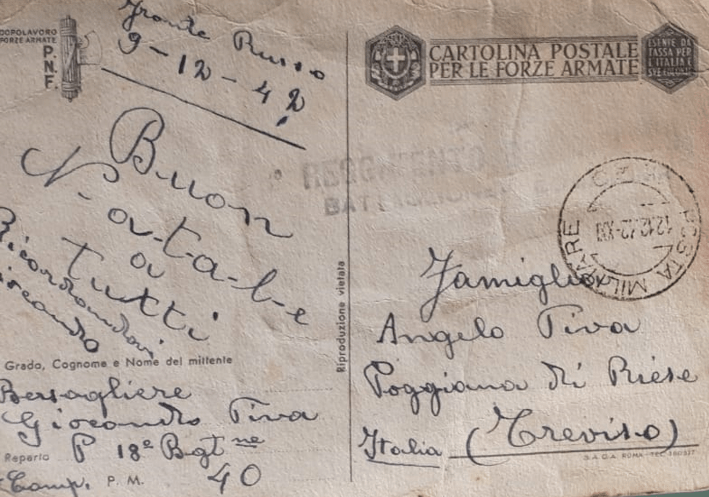 Brevi ma molto significative le lettere che Giocondo Piva scriveva dal fronte ai familiari. Ne alleghiamo una del settembre 1942, in corrispondenza della sua partenza per il fronte russo. Nella lettera del 9 dicembre, una delle ultime inviate prima del tragico epilogo, si legge invece: “Sono al comando di compagnia. Dormo, mangio e bevo e tiro a campare. Sono portaordini. In gamba. Colla speranza di ritornare fra voi vi saluto caramente e vi bacio. Vinceremo. Buon Natale a tutti, Ricordandovi. Giocondo”.