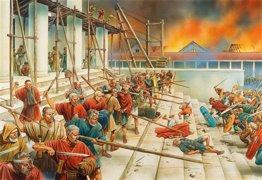 La città cadde al primo colpo, ma non venne espugnata del tutto. Per due giorni un numero imprecisato di veterani (immaginiamo con le proprie o altrui famiglie) riuscì a resistere nel tempio di Claudio. Come abbiamo detto, il tempio e il suo recinto erano quasi completi. Il cortile e le mura che lo circondavano costituito un’ottima postazione difensiva, che però non poteva contare sul vantaggio di un terreno rialzato, né di un fossato per tenere lontani i nemici.