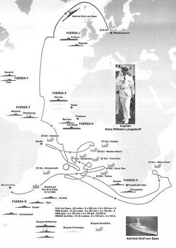 En el marco del despliegue de las Fuerzas aliadas, la dicha División Sudamericana (Fuerza G) de la Royal Navy – formada por los cruceros pesados HMS Cumberland (10.000 toneladas, 8 piezas de 203 mm), y HMS Exeter (8.400 toneladas, 6 piezas de 203 mm) y los cruceros ligeros HMS Ajax y HMNZS Achilles (gemelos, de 7.000 toneladas y 8 cañones de 152 mm) – tenía que vigilar el intenso tráfico marítimo británico desde Pernambuco hasta el Río de la Plata. Una tarea crítica, para el Comodoro Henry Harwood, siendo que el area por patrullar era de más de dos mil millas: aún más pensando que – teniendo Harwood que dispersar sus buques precisamente para vigilar – cabía realisticamente la posibilidad que uno de los solitarios cruceros se topara con el “panzerschiff” alemán, poderosamente armado.