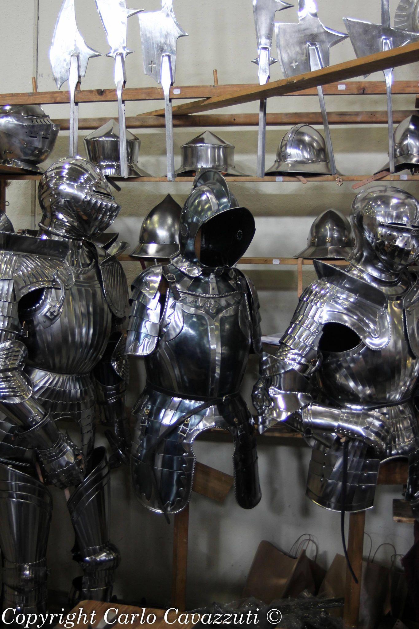 I migliori armorari, armieri, spadari, arcorari e arcobalestrieri d’Europa, e forse del Mondo, riuniti sotto lo stesso tetto. Ed è un girone dantesco perché l’occhio ti cade su quel paio di attrezzi da gamba tutti ricoperti di velluto rosso e ribattini in bronzo sbalzato a mano, che non ti servono e costano l’anima del tuo primogenito maschio, ma sono bellissimi; una spada nuova fiammante lavorata con incisioni ad acquaforte e l’elsa in agata e oro, di cui senti un bisogno quasi carnale, che ti costa l’anima del secondogenito che prometti di concepire in breve, ma solo perché quella del primo l’hai già ipotecata ad altri, e anche subaffittata senza dir nulla al futuro compratore, per avere quella corazzetta ricoperta di scamosciato turchese con le catene come usava nel 1300 che tra le tue tre armature a casa proprio ti mancava; valutare se lasciare la moglie a pegno per il bacinetto a muso di cane che volevi tanto, per un attimo ti passa per la testa.