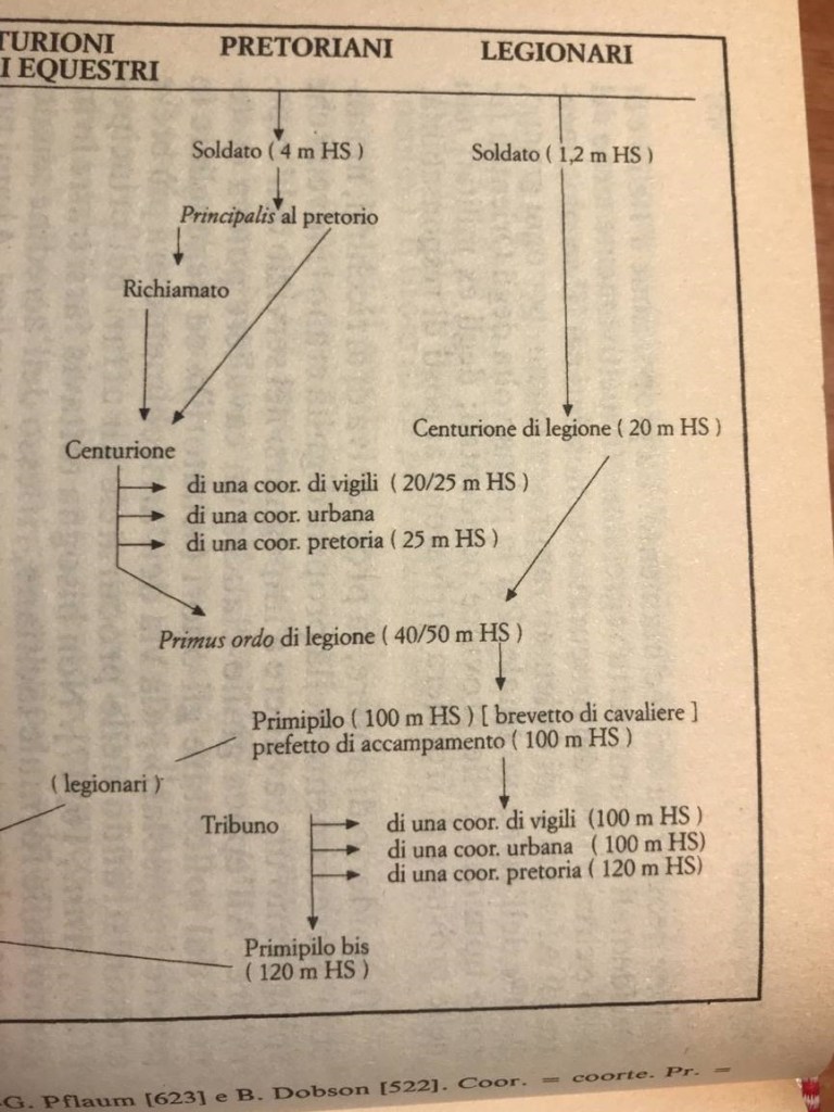 Un pretoriano, dunque, guadagnava oltre il triplo di un legionario. Anche il pretoriano non arrivato al centurionato in carriera, ma fermatosi al grado inferiore di principalis, aveva l’opportunità di accedere al centurionato come evocatus, eventualità non rara considerando la minora ferma dei pretoriani (16-18 anni contro i 22 di media dei legionari). Un pretoriano, dunque, arruolatosi all’età di 20 anni, terminava il servizio intorno ai 36-38 anni e poteva avere ancora molti anni di carriera (i più redditizi) davanti a sè. Al contrario, un legionario partito alla stessa età terminava non prima dei 40-42 anni e, soprattutto, si trovava alla frontiera, non a Roma.