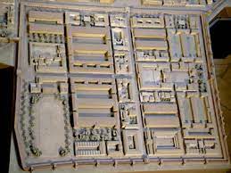 Il campo era diviso simmetricamente da quattro strade maggiori lungo gli assi. Sembra che le caserme fossero lunghi edifici che correvano parallelamente alle strade. Non c’è traccia dei principia, cioè la zona degli uffici dei comandanti, perché tali ruoli e uffici erano forse svolti a palazzo. Quindi sia il prefetto che i tribuni vivevano in città, mentre i centurioni erano i più alti ufficiali in grado residente permanentemente nel campo.