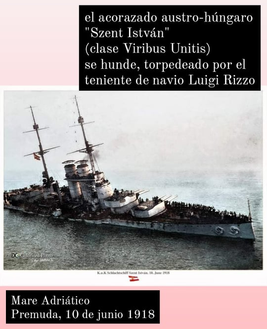 Dicho sea de paso, solo algunos meses después el teniente capitán Luigi Rizzo (futuro Almirante de la Regia Marina, y condecorado con Medalla de Oro al Valor Militar), supo rematar la faena, infligiendo un golpe mortal a la Armada Austro-húngara: en el amanecer del día 10 de junio de 1918, en las aguas de la Isla de Premuda, liderando el grupo de los MAS 15 y MAS 21, Rizzo logró torpedear y hundir el acorazado «Szent István» (20000 t de desplazamiento, armamento principal 12 cañones de 305 mm), que después de haber salido de la base de Pola junto a su gemelo el acorazado «Admiral Tegetthoff», navegaba con rumbo al sur hacia la denominada “Barrera de Otranto”. Imposibilitado a seguir en su acción ofensiva, en la que fue su última salida, el «Admiral Tegetthoff» tuvo que regreasar a Pula.
