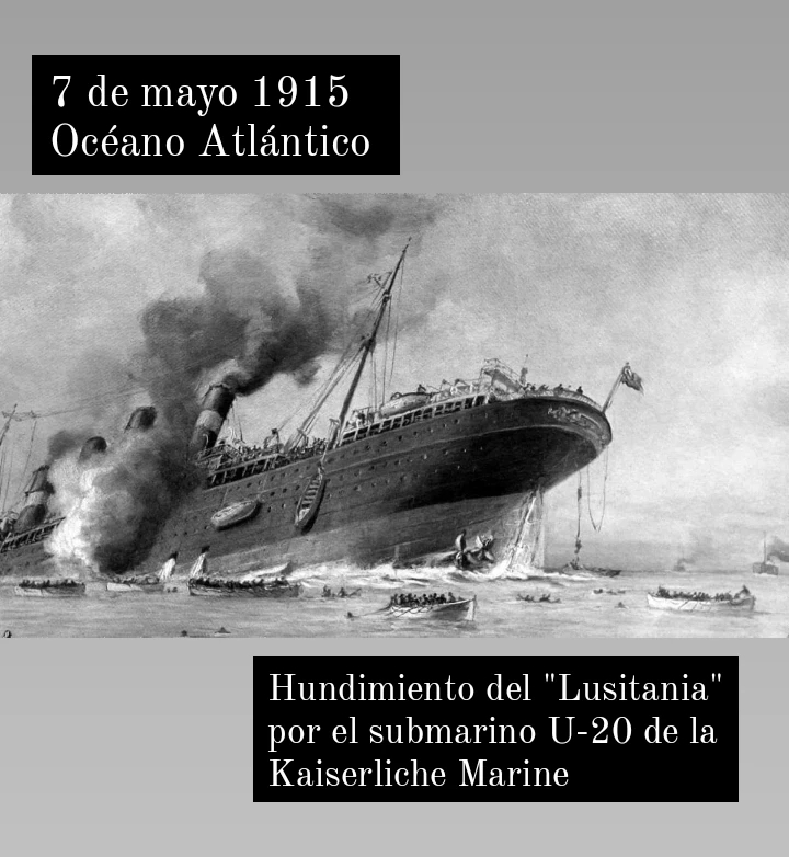 Primera guerra mundial – Hundimiento del transatlántico RMS «Lusitania» en Océano Atlántico, torpedeado por el submarino alemán U-20 bajo el mando del comandante Kapitänleutenant Walther Schwieger: un episodio que, a más de un siglo de distancia de los acontecimientos, sigue siendo muy “dudoso” históricamente hablando y no acaba de alimentar sospechas sobre una postura de despiadado cinismo por parte de las Naciones Aliadas en el bando de la Entente.