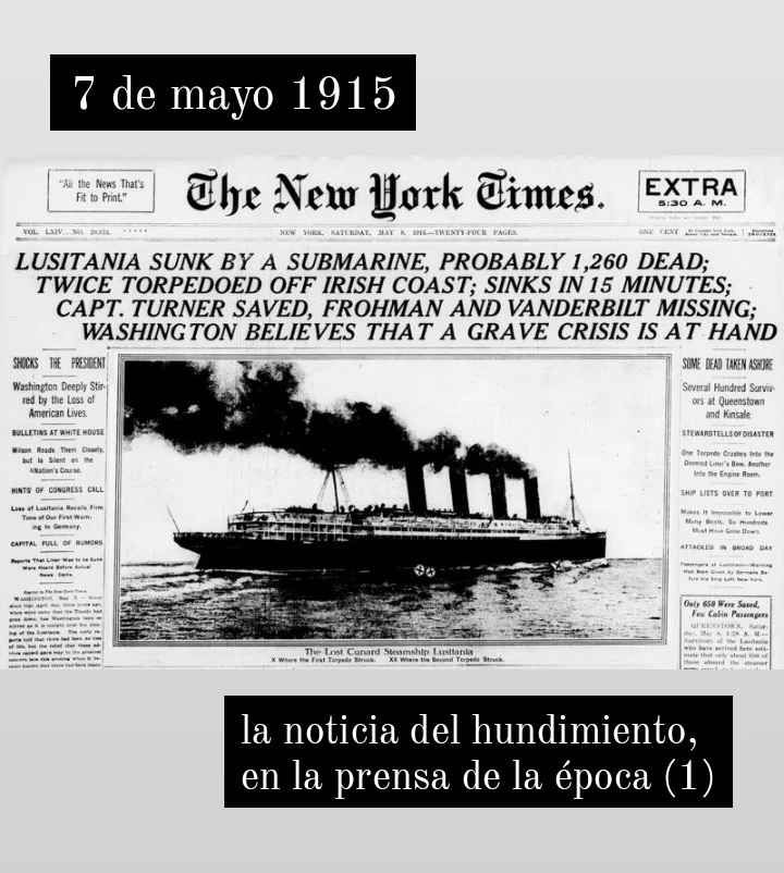 - 1) el RMS «Lusitania», a pesar de ser un transatlántico repleto de pasajeros, no podía ser considerado tal como un buque neutral: técnicamente clasificado como “crucero auxiliar”, iba cargado de armas y material bélico rumbo a Inglaterra;