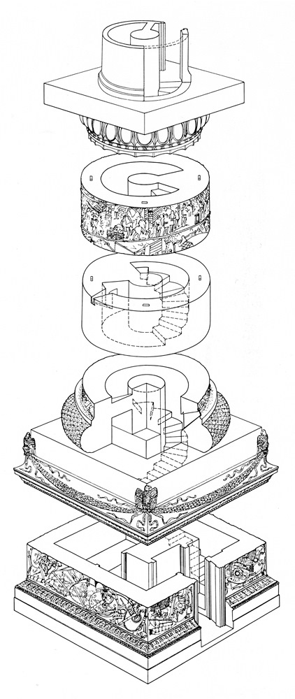 Il modo di lavorazione e queste precise modificazioni prospettiche presuppongono un modello disegnato che precede e determina l’esecuzione dei rilievi. Questi, tenuti bassissimi per non alterare la linea architettonica della Colonna (come avverrà invece nella Colonna di Marco Aurelio) conservano, infatti, modi disegnativi pittorici. Le figure sono spesso poste in evidenza da un solco di controno che, creando un’ombra, pone in risalto il disegno; talore alcune parti delle figure finiscono per affondare nel piano di fondo e sono espress in incavo anziché in rilievo.
