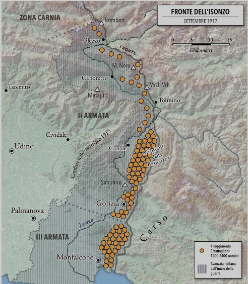 Alla fine di questo giro d’orizzonte, è giocoforza ammettere che la scarsità del velo di truppe steso, in origine, sul fronte che il nemico aveva deciso di attaccare era stata in gran parte rimediata con i provvedimenti presi da Cadorna e Capello, Badoglio e Cavaciocchi negli ultimi giorni. Ai primi di settembre, quando Krafft von Dellmensingen [ex-comandante degli Alpenkorps e ufficiale di stato maggiore di von Below] aveva fatto il suo giro d’ispezione, i battaglioni inquadrati nelle quattro divisioni italiane schierate dal Rombon al Krad Vrh erano in tutto 45; con i rinforzi degli ultimi giorni, l’organico era salito a 57 battaglioni, uno per ogni chilometro di fronte.
