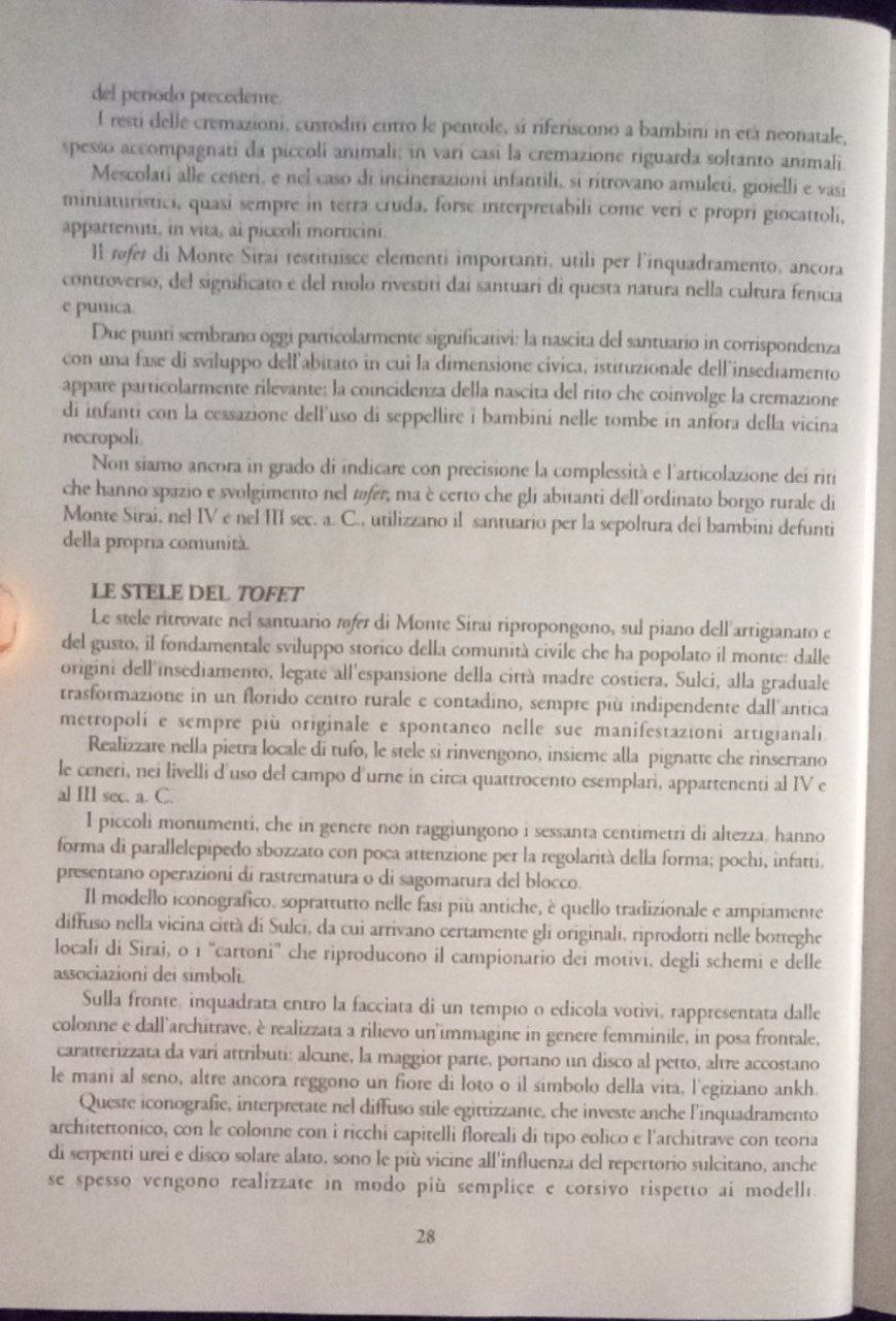 La nostra lettrice Alessandra Vargiu mi segnala questa interessante guida turistica del tofet di Monte Sirai, legato all’insediamento della città di Sulci, in Sardegna, dove le testimonianze della presenza della civiltà punica sono numerose. Pagine preziosissime perché illustrano lo sviluppo di un tofet, i cambiamenti interventi nel corso del tempo nei ritrovamente effettuati e il quadro, in parziale contrasto con quello delle fonti antiche, che emerge dalle urne e dalle stele.