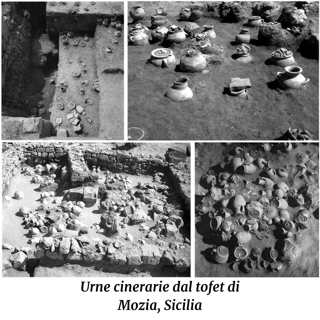 Abbiamo accennato alla testimonianza delle fonti letterarie antiche sulla pratica, fenicia e cartaginese, di sacrificare o dedicare (cruento o meno che fosse il rito) bambini alle proprie divinità. Tale asserzione ha trovato “conferma”, se così si può dire, nella scoperta, a partire dalla metà dell’800 fino a culminare nella scoperta del grande tofet di Cartagine nel 1921, di numerosi siti dove sono stati trovati resti cremati di bambini e animali, assieme a stele votive.