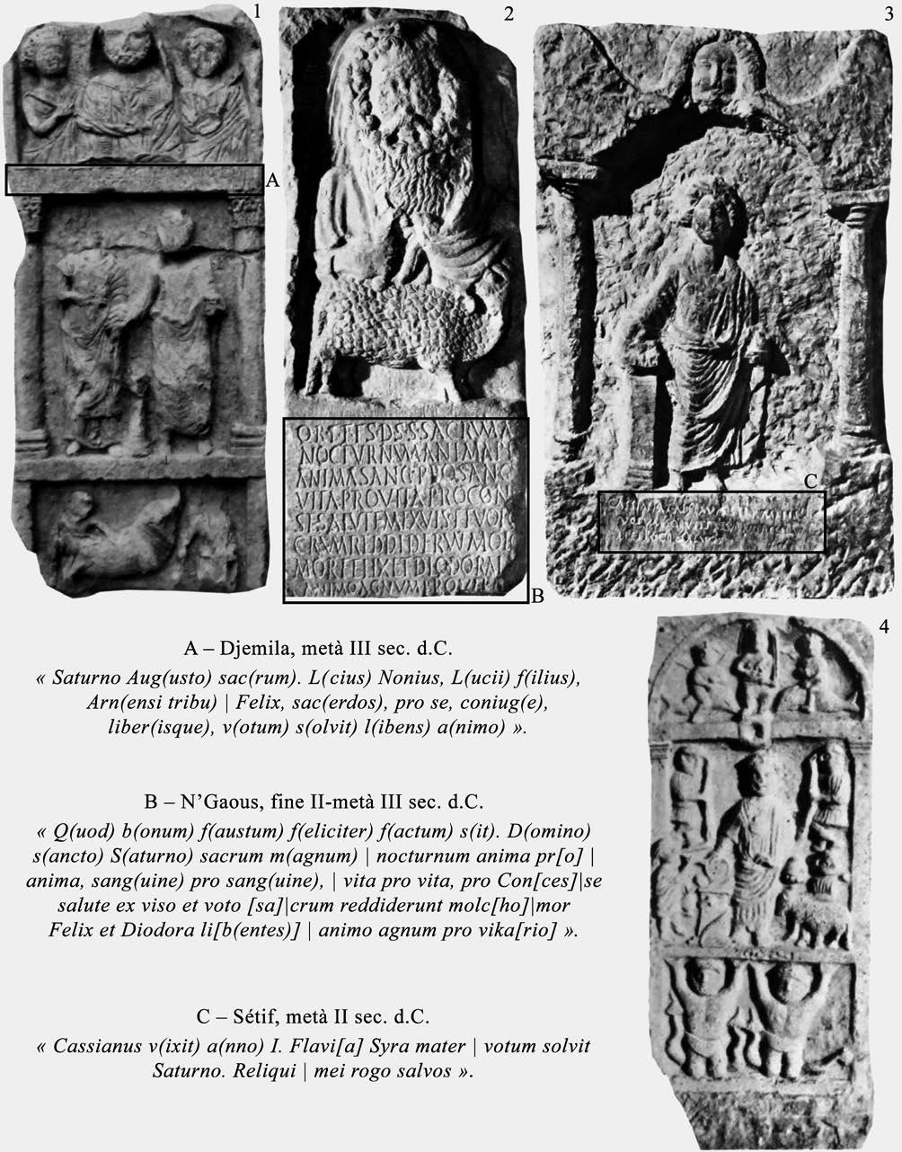 Le oltre 3000 stele votive provenienti dai santuari di Saturno si pongono in continuità stilistica e formale con le stele dei tofet di età tarda, ma il rapporto con la tradizione punica si esaurisce nel corso del tempo e vengono introdotti diversi elementi figurativi di tradizione classica.