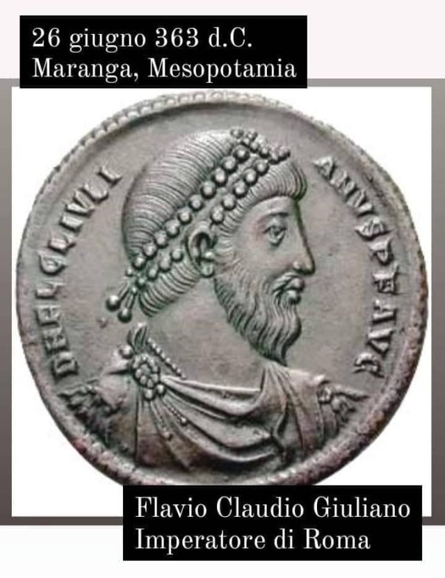 Flavio Claudio Giuliano, giovane imperatore e ultimo «Optimus Princeps›› della storia di Roma, cade in combattimento nel cuore della Mesopotamia: a Maranga, sulla strada per Samarra durante la risalita verso settentrione proveniente da Ctesifonte, dopo aver sconfitto il secolare nemico sasanide sotto le mura della sua capitale, sulle rive del Tigri, il 29 maggio precedente.