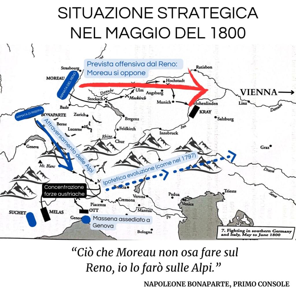 Nella primavera 1800 Napoleone doveva dunque decidere dove concentrare i suoi sforzi. La sua prima idea fu quella di rispettare l’ordine classico delle cose; concentrare le forze sul Reno per raggiungere rapidamente Vienna mentre teneva in Italia una forza secondaria che non doveva far altro che resistere e proteggere il sud della Francia dall’invasione austriaca.