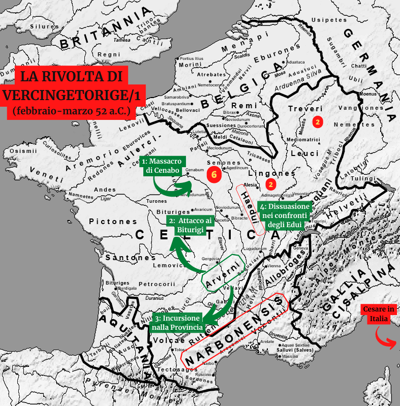 Nell’inverno successivo (53-52 a.C.) i Galli trovano un valido condottiero: Vercingetorige, nobile di discendenza reale ma da qualche tempo messo ai margini della politica del proprio popolo, gli Arverni. Egli conosce tattiche e strategie del nemico perché, probabilmente, ha militato tra le fila romane come ufficiali degli ausiliari. Vercingetorige agisce tempestivamente per cogliere Cesare di sorpresa. Il suo obiettivo è convincere le ultimi grandi tribù restie alla rivolta ad unirsi a lui: per raggiungere ciò, deve dimostrare di essere più forte dei Romani; inoltre, deve impedire a Cesare, ancora in Italia, di ricongiungersi con le proprie legioni.