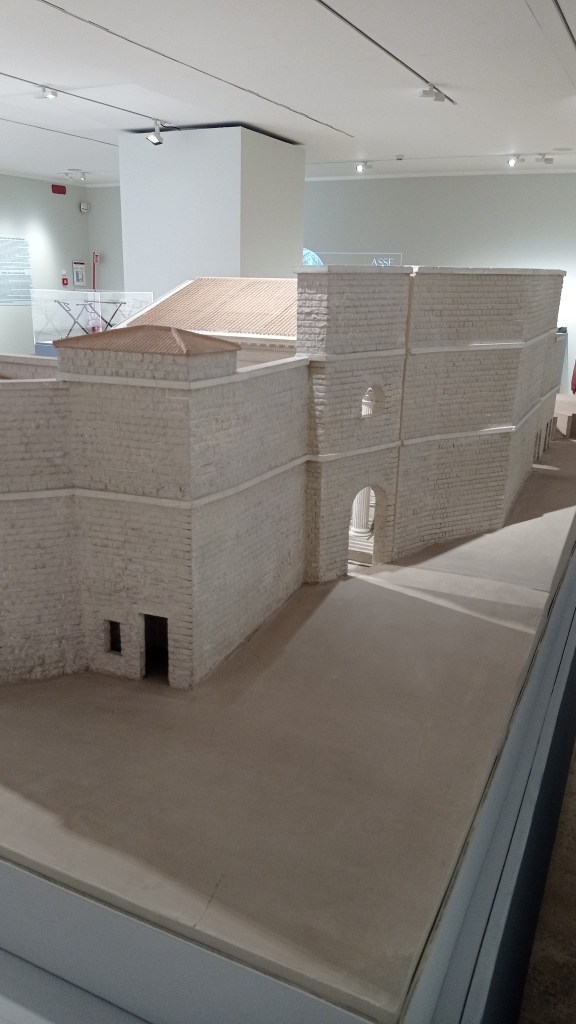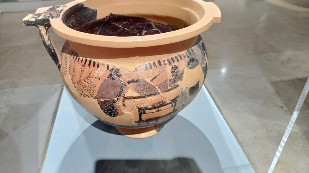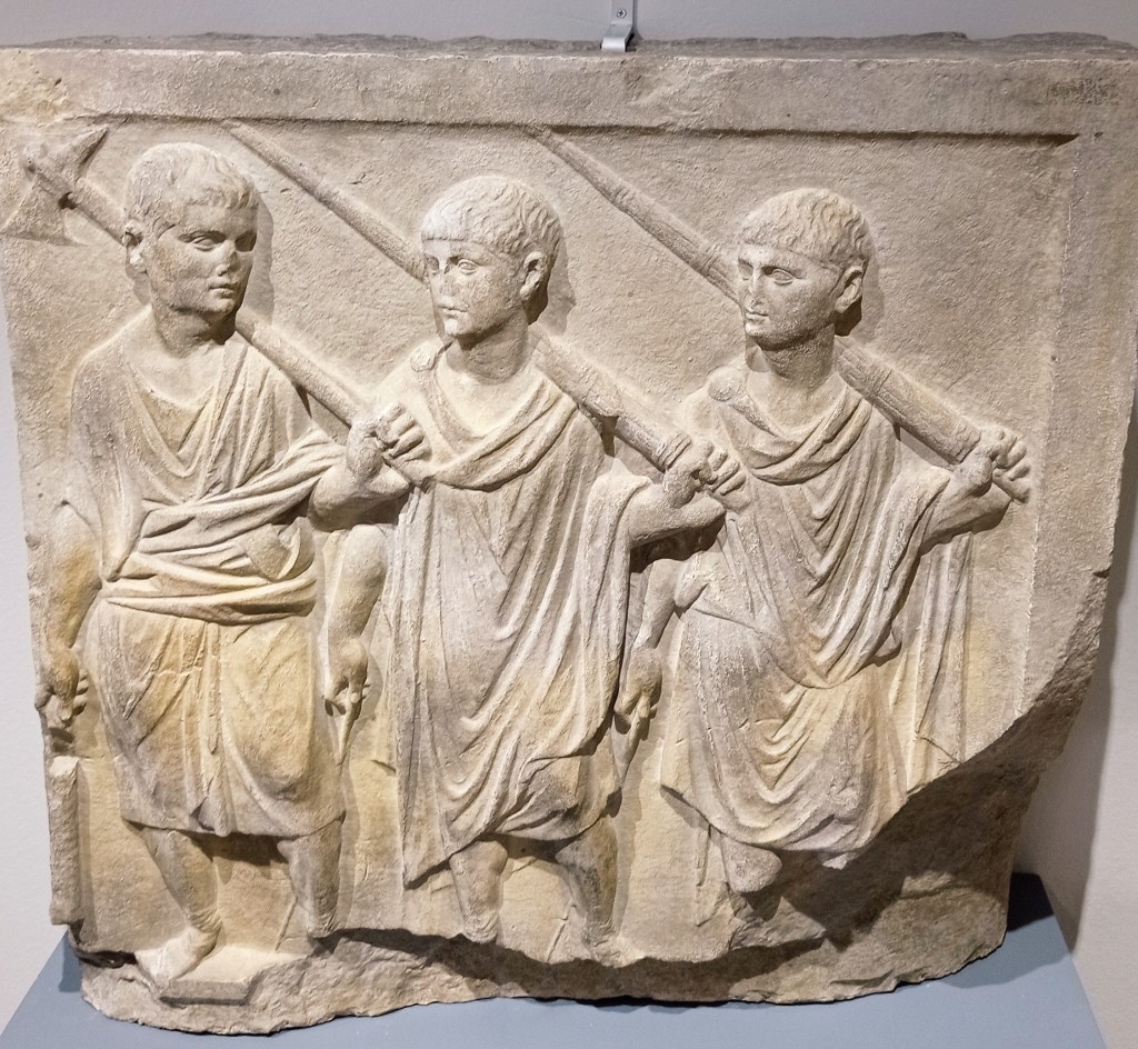 Uno dei reperti più interessanti, almeno per il sottoscritto è stato rappresentato dal seguente oggetto. Ahimé ho dimenticato di fotografare il cartellino, quindi devo fare affidamento alla memoria: credo fosse un piccolo monumento votivo oppure funebre; forse, anche un trofeo d’armi. Da aprezzare la panoplia completa, le insegne e le armi.