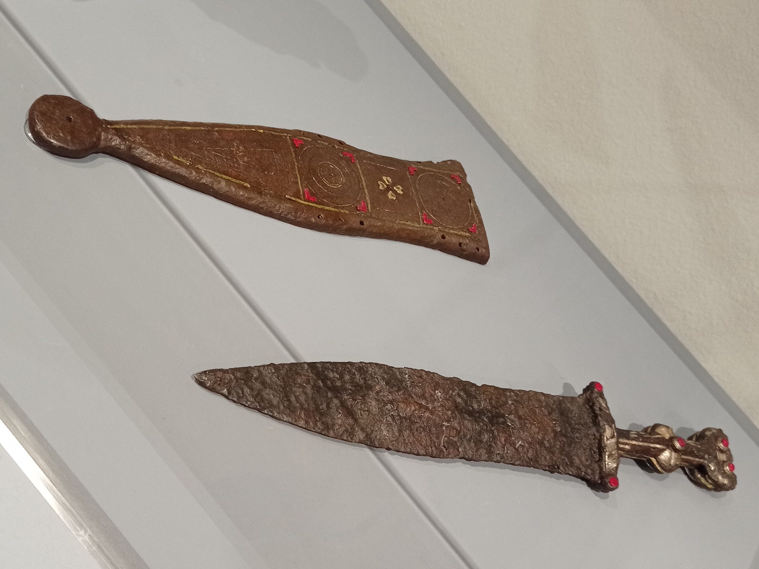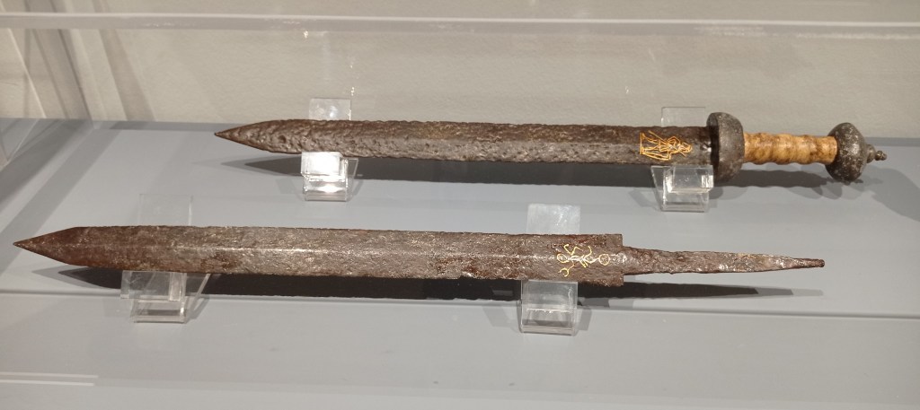 Interessante l’accostamento, a poca distanza dal precedente reperto, di un gladio e di un pugnale con tanto di fodero: il riferimento credo sia ad un passo della biografia di Caligola di Svetonio: