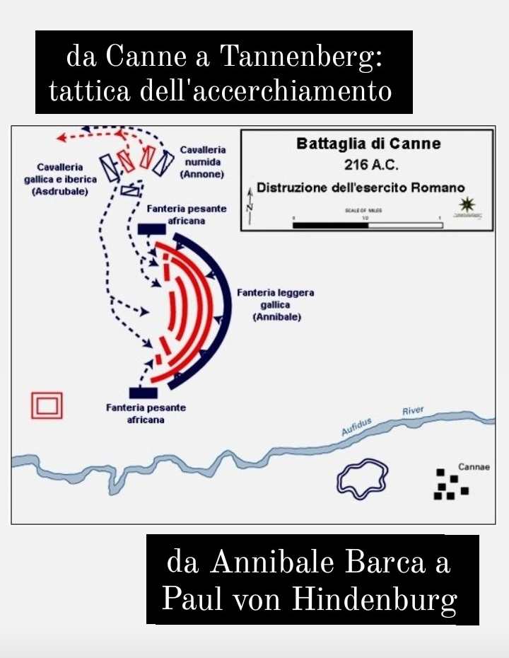 Sia detto per inciso, il sogno si concretizzò nella Prima Guerra Mondiale: proprio la tattica dell’accerchiamento era stata per decenni la “bussola tattica” dell’Accademia Militare Prussiana (Preußische Kriegsakademie), la cui massima espressione fu il cosiddetto «Schlieffen-Plan». Il famoso piano, elaborato dal Conte Alfred von Schlieffen (1833-1913), Comandante in capo dello Stato Maggiore del Secondo Impero Tedesco, era concretamente inspirato alla geniale manovra attuata a Cannae da Annibale: e se il «Schlieffen-Plan» propriamente detto non ebbe successo a occidente (dovuto alle incertezze ed alla mancanza di decisione degli alti gradi dello Stato Maggiore Tedesco, indegni eredi di von Moltke “il Vecchio” e dello stesso Schlieffen), sul fronte della Prussia Orientale il Maresciallo Paul von Hindenburg inflisse ai Russi una devastante sconfitta nella zona dei Laghi Masuri, proprio applicando la tattica dell’accerchiamento. Infatti, la Battaglia di Tannenberg (26-30 agosto 1914) è stata interpretata come “la Cannae del XX Secolo”.