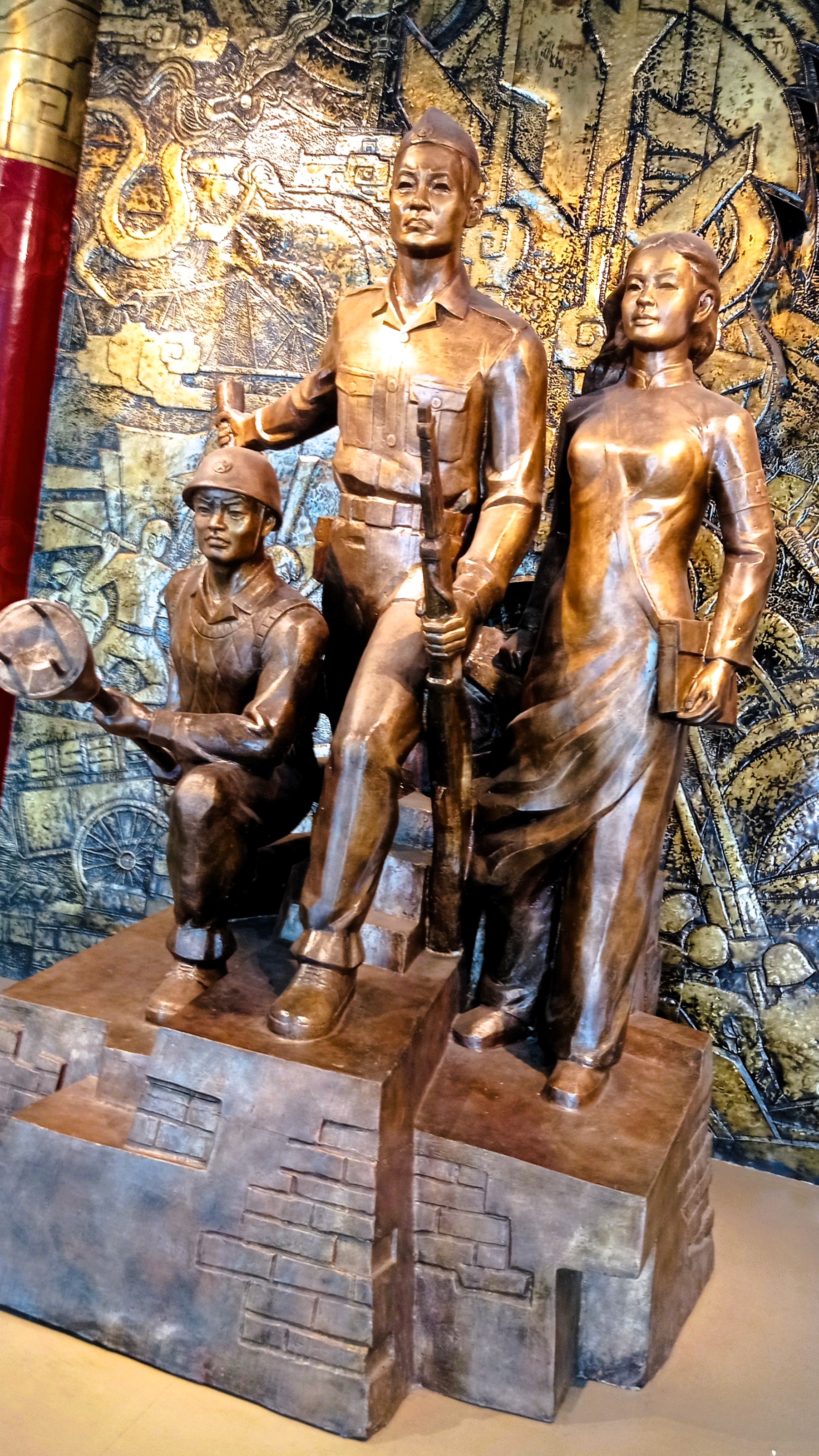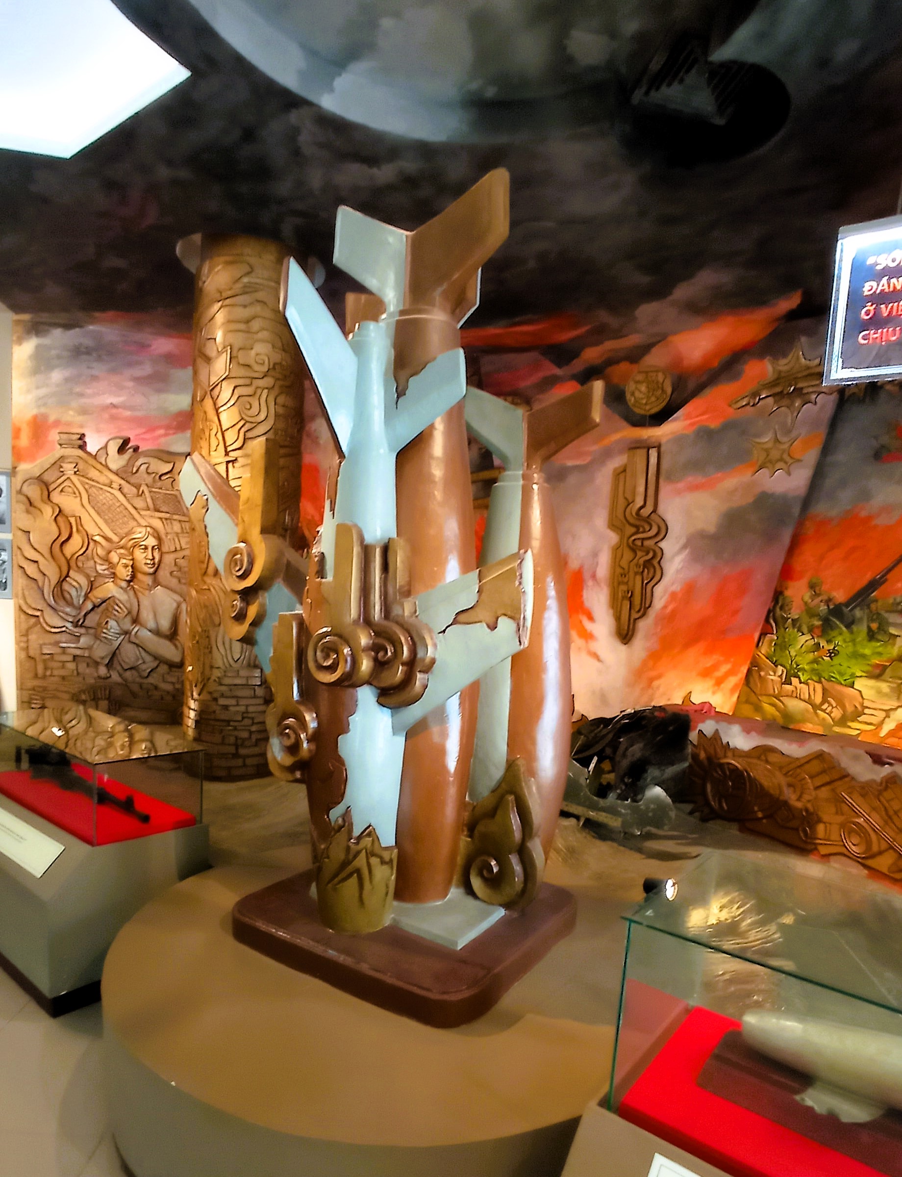 Le altre sale egualmente celebrative, ma raffigurano anche la durezza della guerra. Una sala ospita una “scenografia” mista di rilievi di bronzo con dipinti parietale. Da sinistra a destra è possibile osservare diverse fasi della battaglia: la distruzione degli edifici pubblici, la fuga degli sfollati, la risposta della contraere, l’abbattimento di un B-52: quest’ultima immagine è ricorrente in tutto il museo e, confesso, ritengo abbia anche un valore artistico. Il trionfo finale del popolo vietnamita – così interpreto io – è rappresentato dalla verticalità assoluta dell’aereo, un qualcosa che può vivere solo in orizzontale, altrimento è destinato a schiantarsi. La verticalità della rappresentazione, quasi totemica, conferisce un che di “religioso” o almeno spirituale alla raffigurazione.
