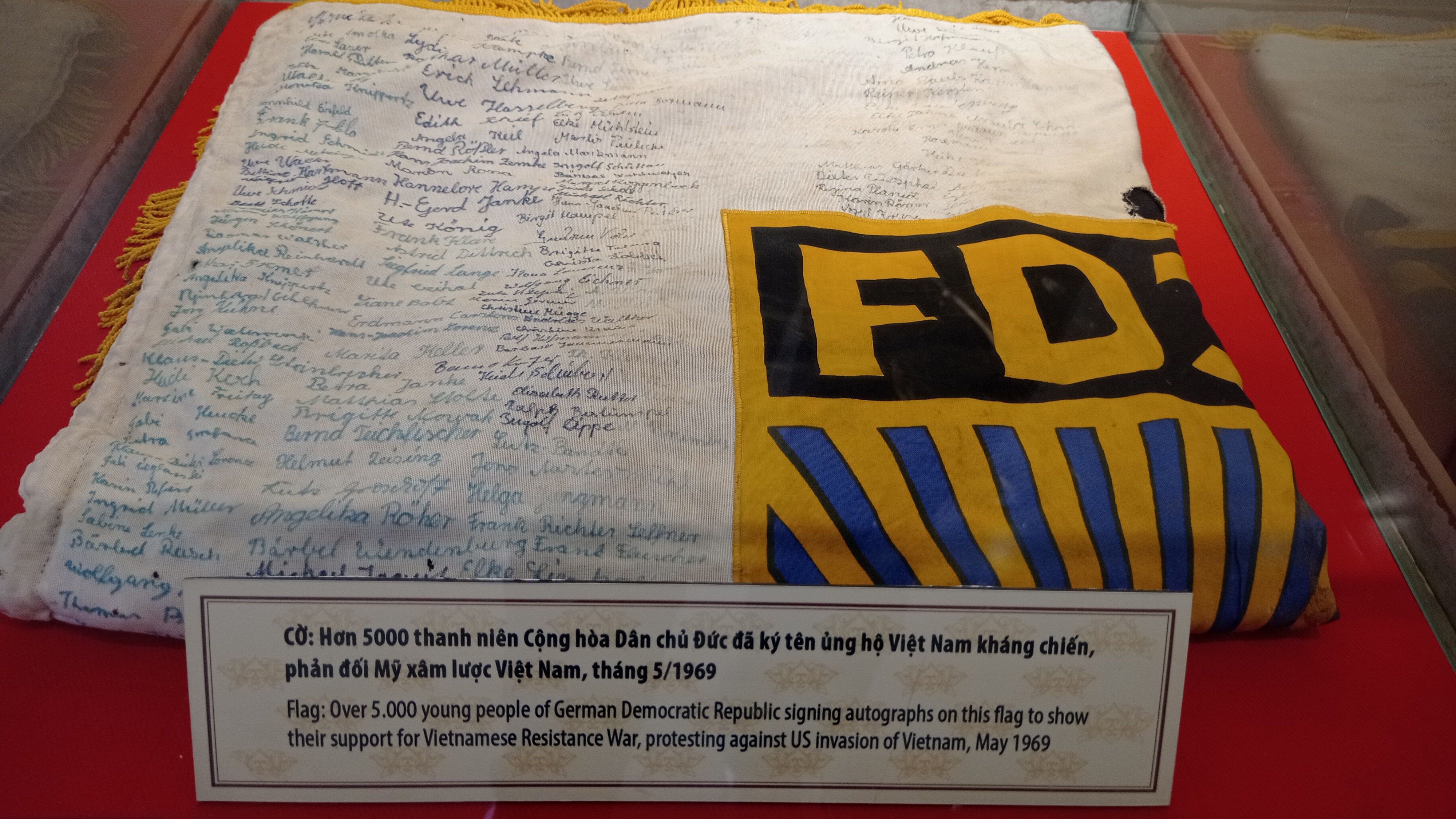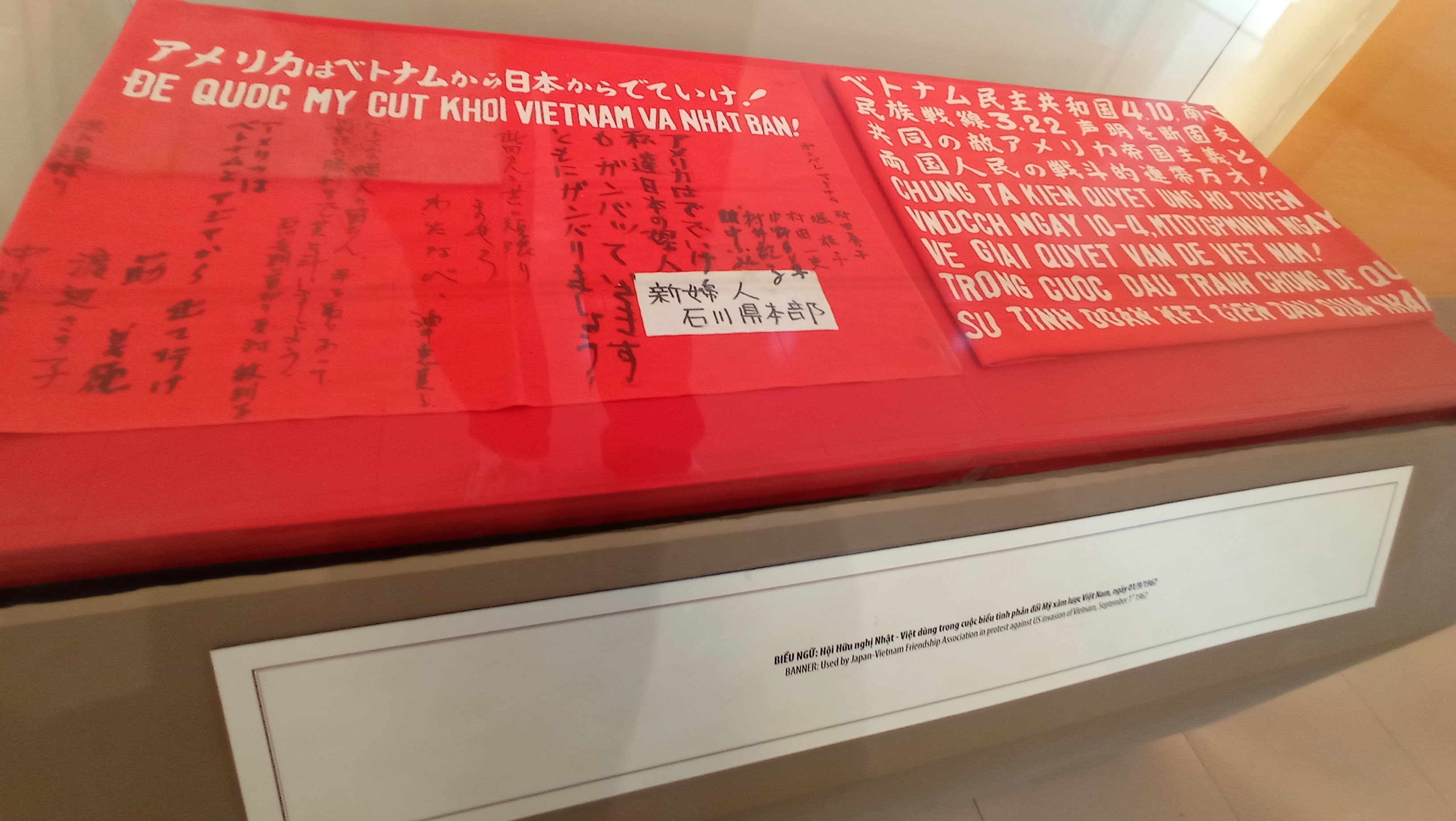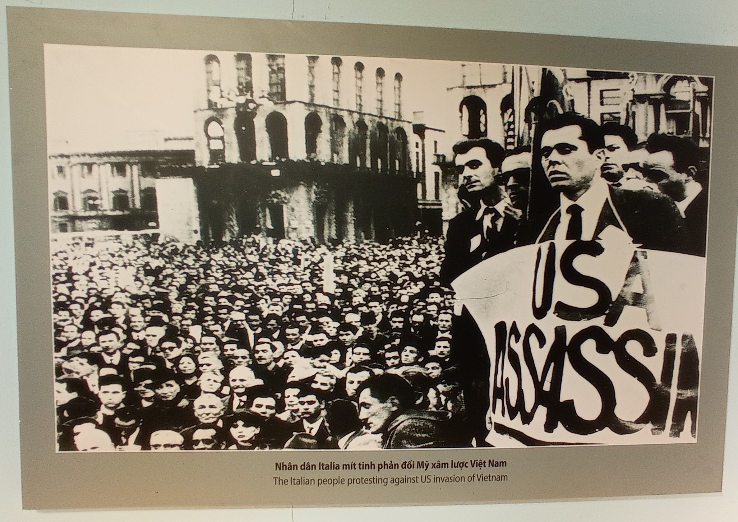 La seconda sala del piano, dall’eloquente titolo “Il mondo al Vietnam, la nazione intera ad Hanoi”, alcune testimonianze del grande supporto popolare che la causa vietnamita suscitò in giro per il mondo: ci sono anche testimonianze dall’Italia.