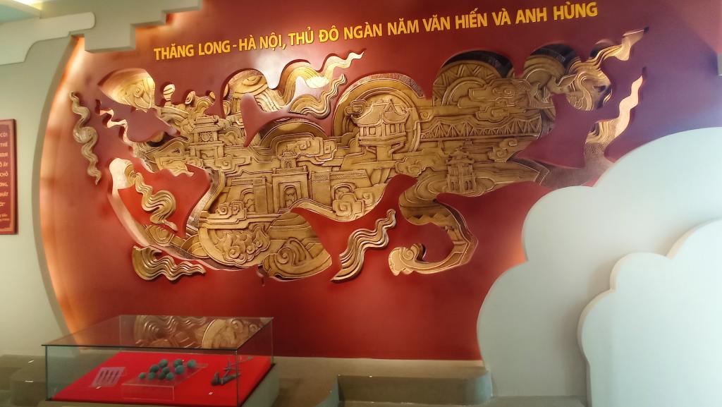 Sulla sinistra, alcune teche ospitano reperti di antiche dinastie del Vietnam, ma è senza dubbio affascinante il grande rilievo di bronzo che, dalla forma di drago, raffigura Hanoi così com’era nei tempi passati. Tale scelta non è casuale, perché l’antico nome di Hanoi era “Thang Long”, ovvero il “drago che vola”.