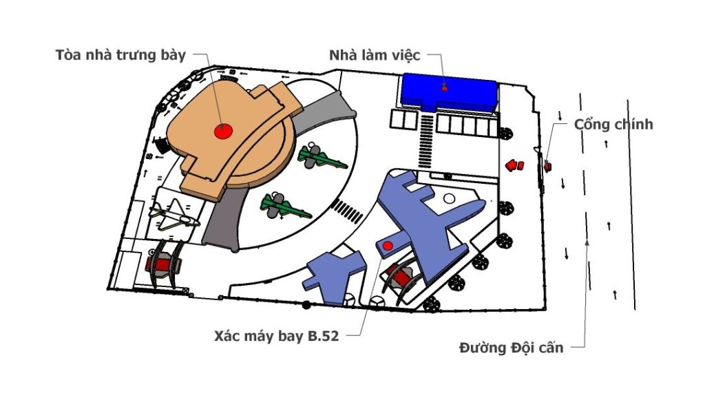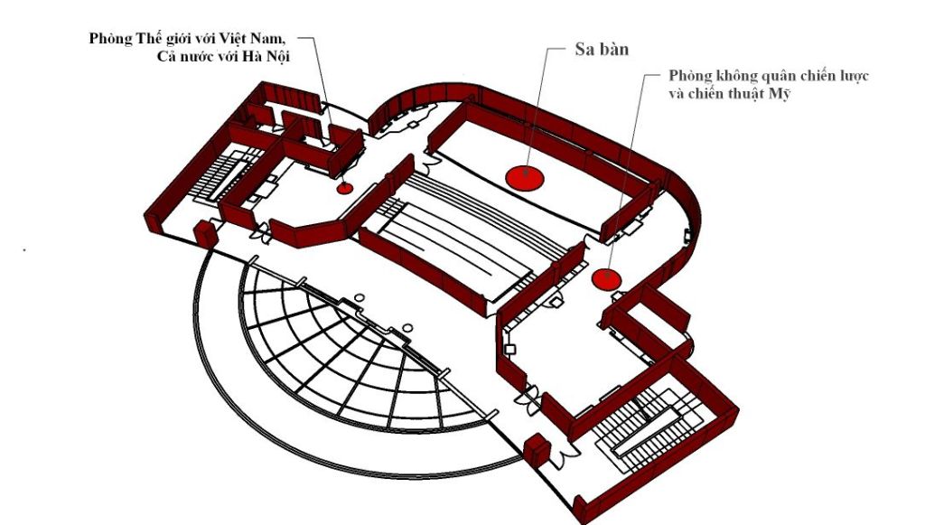 L’interno del museo si articola su due piani. Il primo è dedicato alle forze armate della provincia di Hanoi e agli avvenimenti avvenuti in questa regione nell’arco dell’intera storia vietnamita; il secondo piano, invece, oltre ad una ricostruzione con manichini del comando di Hanoi durante l’operazione Linebacker II, ospita una sala dedicata agli americani e una seconda invece al supporto mondiale per la causa vietnamita.