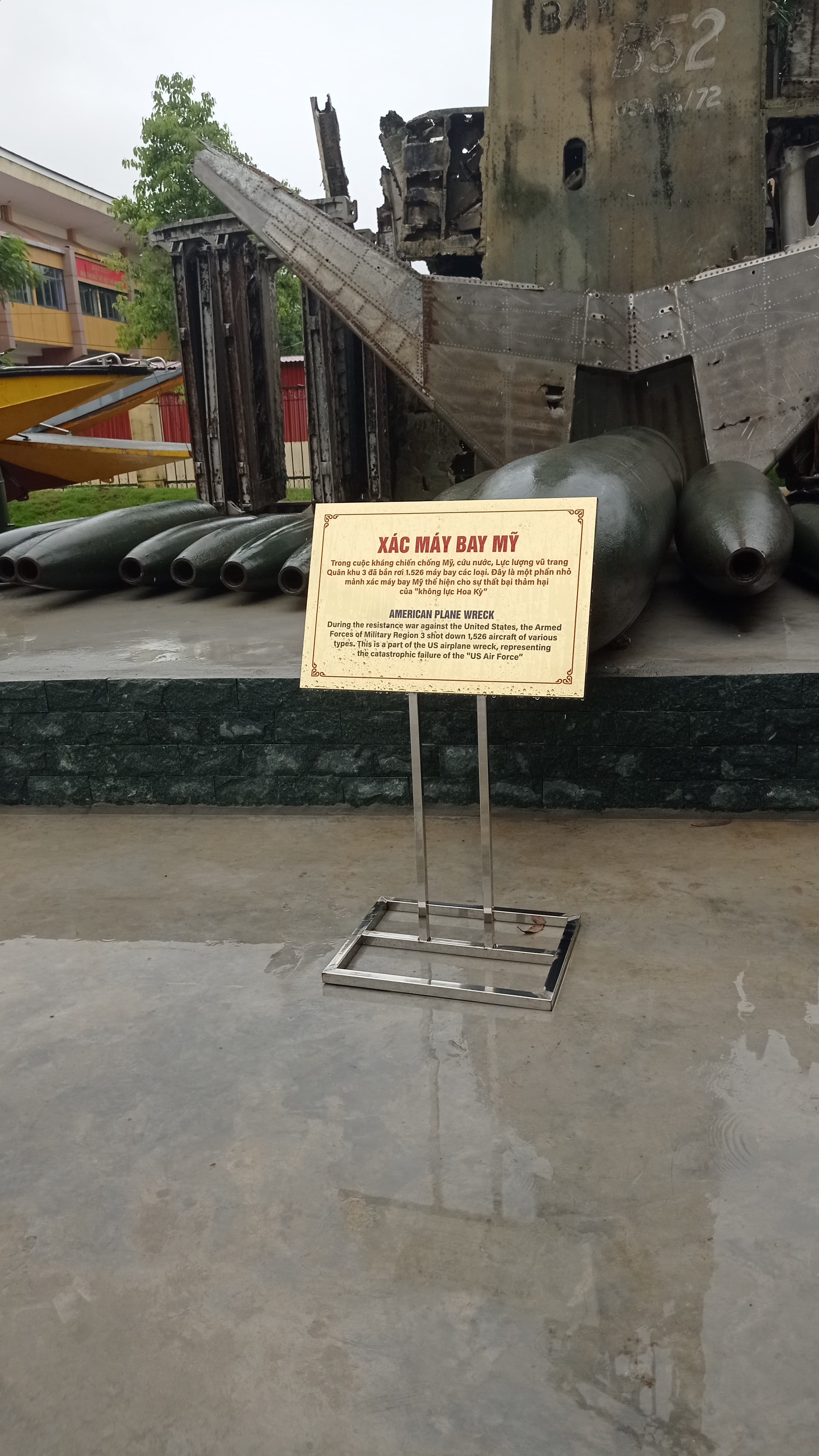 Il relitto più imponente, che sembra essere l’ala di un B-52, riporta una didascalia significativa di come si racconta la storia qui in Vietnam: “durante la guerra di resistenza contro gli Stati Uniti, le forze armate della Regione militare 3 hanno abbattuto 1526 aerei di vario tipo. Questa relitto di un aereo USA rappresenta il catastrofico fallimento della “Us Air Force”.
