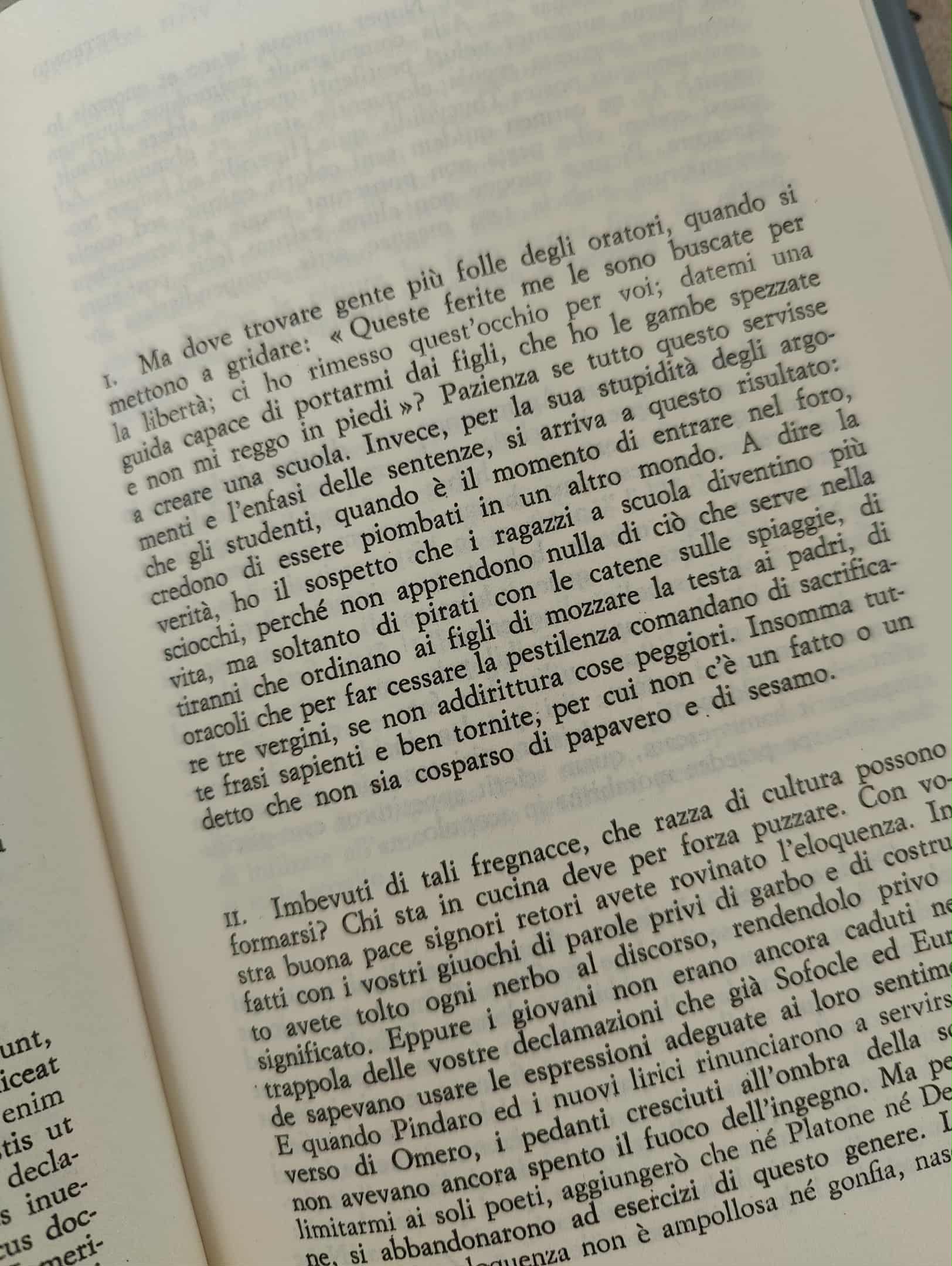 [Sono forse di un altro tipo le smanie che tormentano i declamatori quando affermano: “Queste ferite me le sono procurate per la libertà del paese; quest’occhio l’ho perso per voi; datemi una guida che mi guidi dai miei figli perché i garretti recisi non mi reggono più in piedi”? Sproloqui come questi sarebbero di per sé sopportabili se facilitassero la strada a quelli che vogliono darsi all’oratoria. Ma a forza di tirate piene di niente e frasi berciate a vanvera, il solo effetto che ne deriva è di farli sentire in un altro mondo non appena mettono piede nel foro. Ed è per questo, a parer mio, che nelle scuole i ragazzi rimbecilliscono perché non vedono e non sentono niente di quello che abbiamo sotto mano, ma solo pirati che tendono agguati sulle spiagge con tanto di catene, tiranni che emettono editti con l’ordine ai figli di tagliare la testa ai propri padri, responsi di oracoli che impongono di immolare tre o più verginelle per placare un’epidemia, o ancora bolle di parole in salsa di miele e tutti quei fatti e detti che sono come conditi col sesamo e il papavero. (…) L’oratoria grande e – mi verrebbe da dire – onesta non vive di trucchi né di gonfiature, ma svetta per bellezza naturale. È da poco che questa logorrea tutta vuoti e turgori si è abbattuta dall’Asia su Atene, e come una stella del male ha invasato le menti delle giovani promesse, così che, una volta corrotti i princìpi, l’eloquenza è rimasta basita nel suo silenzio.]