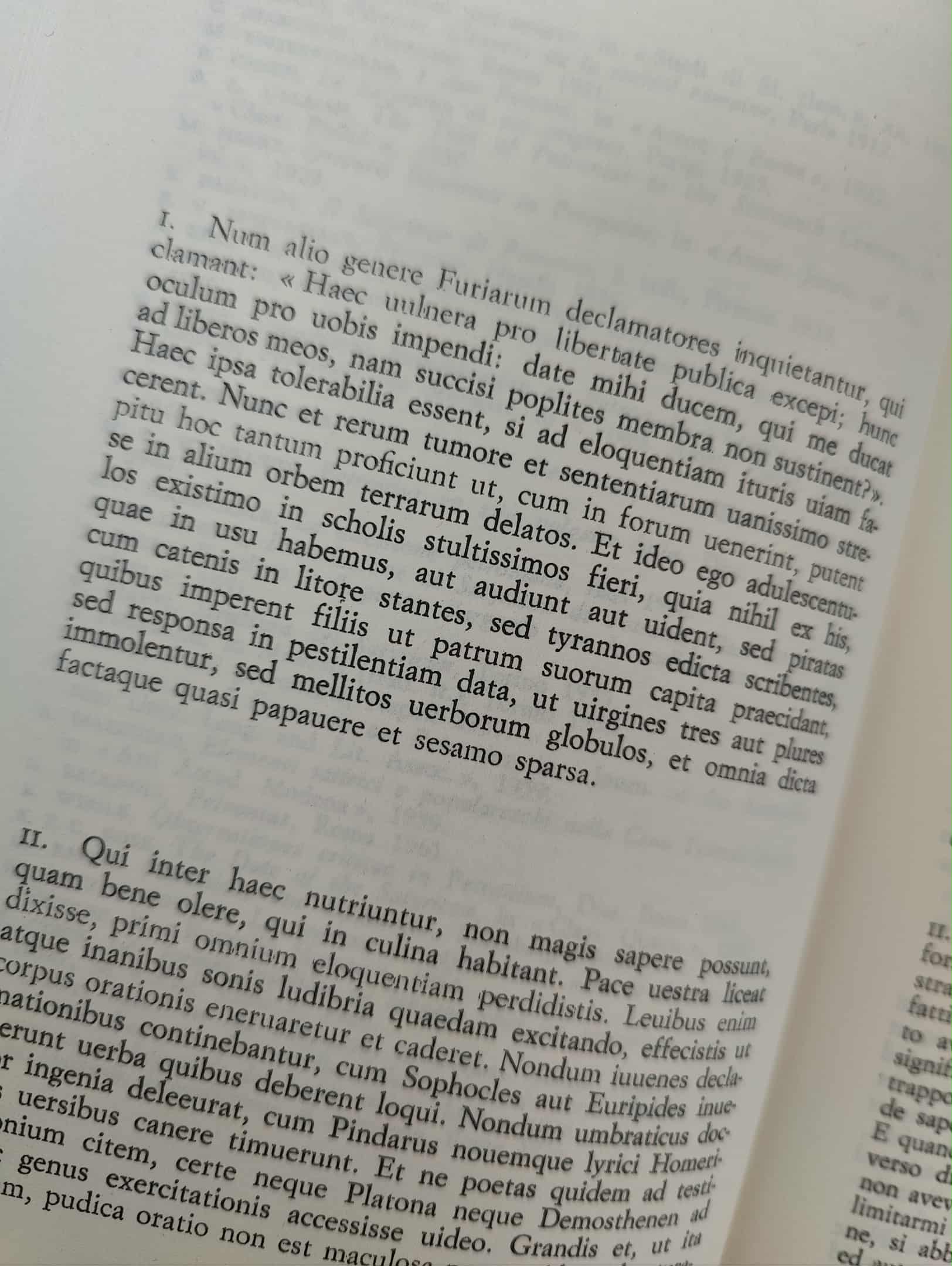 ‹‹Num alio genere Furiarum declamatores inquietantur, qui clamant: “Haec vulnera pro libertate publica excepi; hunc oculum pro vobis impendi: date mihi ducem, qui me ducat ad liberos meos, nam succisi poplites membra non sustinent”? Haec ipsa tolerabilia essent, si ad eloquentiam ituris viam facerent. Nunc et rerum tumore et sententiarum vanissimo strepitu hoc tantum proficiunt ut, cum in forum venerint, putent se in alium orbem terrarum delatos. Et ideo ego adulescentulos existimo in scholis stultissimos fieri, quia nihil ex his, quae in usu habemus, aut audiunt aut vident, sed piratas cum catenis in litore stantes, sed tyrannos edicta scribentes quibus imperent filiis ut patrum suorum capita praecidant, sed responsa in pestilentiam data, ut virgines tres aut plures immolentur, sed mellitos verborum globulos, et omnia dicta factaque quasi papavere et sesamo sparsa. (…) Grandis et, ut ita dicam, pudica oratio non est maculosa nec turgida, sed naturali pulchritudine exsurgit. Nuper ventosa istaec et enormis loquacitas Athenas ex Asia commigravit animosque iuvenum ad magna surgentes veluti pestilenti quodam sidere adflavit, semelque corrupta regula eloquentia stetit et obmutuit.››