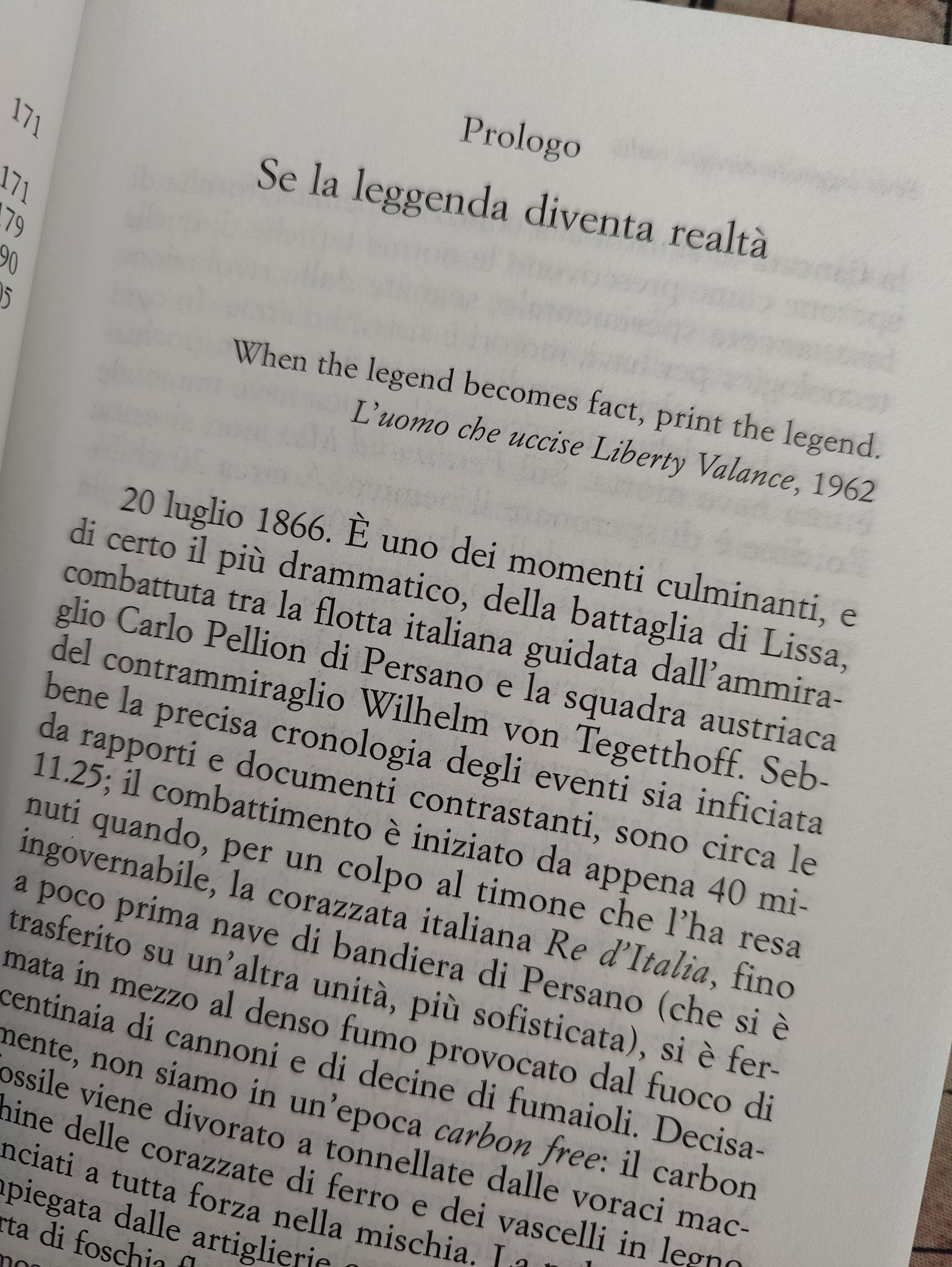 Ora questo libro, che si inserisce in una serie di approfondimenti e studi che si sono articolati in tempi diversi: per esempio, con la lettura di brillanti saggi quali Avanti, Savoia! Miti e disfatte che fecero l’Italia (1848-1866) di Gianni Rocca e Generali. Controstoria dei vertici militari che fecero e disfecero l’Italia di Domenico Quirico, nonché con i più specifici e stupendi contributi di Alberto Santoni, noto e apprezzato esperto di storia della guerra navale. Nel libro di Giovanni Da Frè, secondo una tecnica espositiva già apprezzata per esempio con Adua, dello stesso Quirico, oppure in Jutland e La sconfitta di Farsalo di Sergio Valzania, l’episodio centrale rappresenta una sorta di punto d’arrivo di una trattazione più ampia: e che viene da lontano. Qui la Battaglia di Lissa viene proposta in almeno tre distinti piani di lettura.