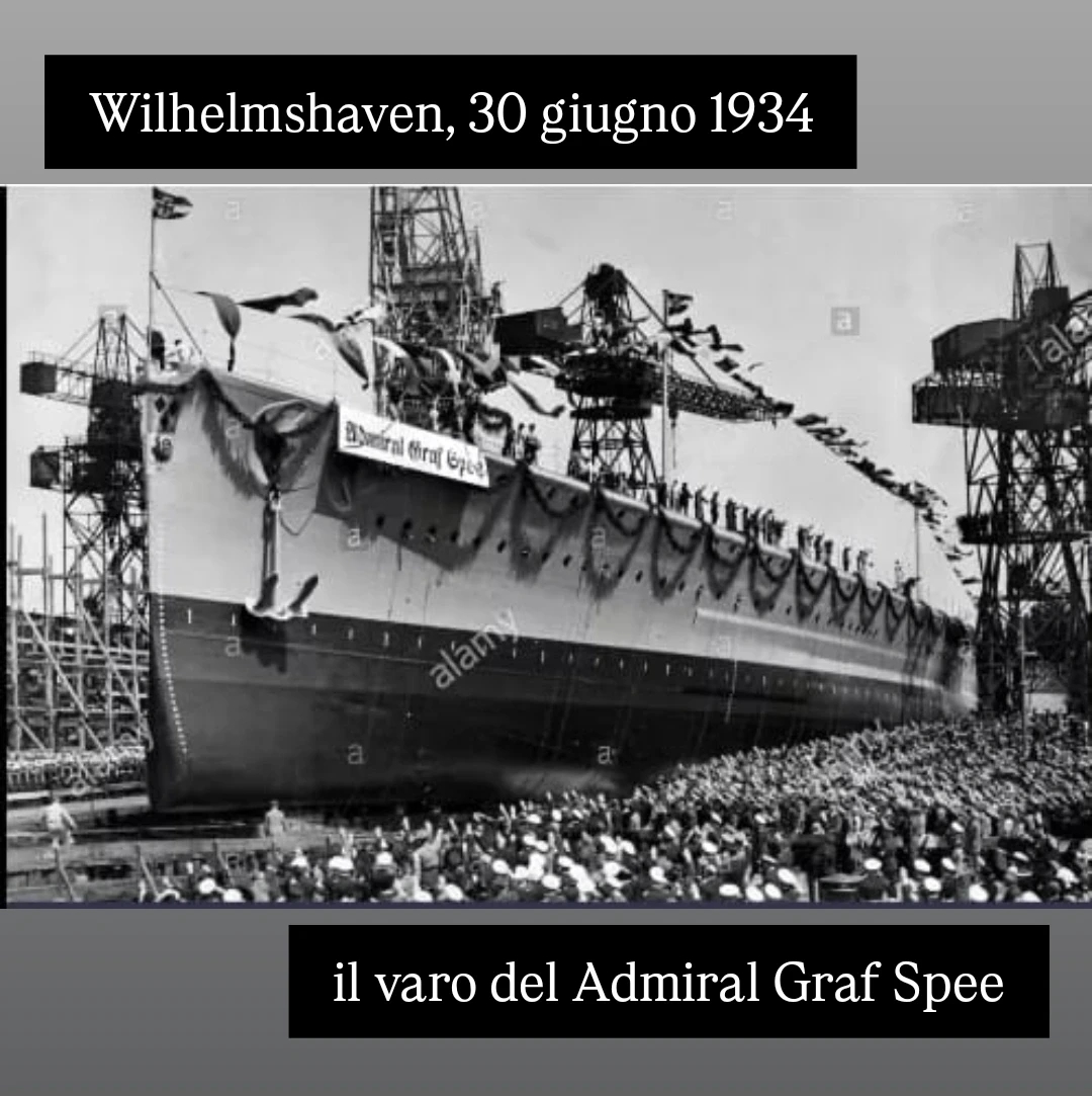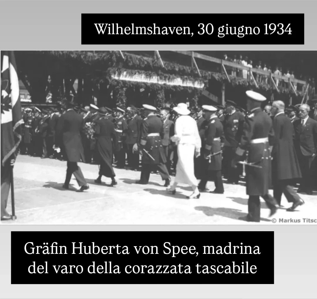 Wilhelmshaven, 30 giugno 1934: Gräfin Huberta von Spee, figlia dell’Ammiraglio caduto il giorno 8 dicembre 1914 a bordo del SMS Scharnhorstnelle acque delle Isole Falkland (dove la Divisione Navale d’Oriente venne completamente annientata da una poderosa squadra della «Royal Navy»: battaglia nella quale la donna aveva perso anche i suoi due fratelli Otto e Heinrich, entrambi ufficiali imbarcati sul SMS Gneisenaue sul SMS Nürnberg), fu la madrina della cerimonia del varo della nuovissima unità che portava il nome di suo padre. Inoltre, sul parapetto del ponte di comando del «panzerschiff»– il cui disegno riproduceva le merlature di un castello – era posizionata una targa nera nella quale si leggeva la parola «Coronel» (scritta in caratteri gotici, a lettere d’oro): a perpetuare il ricordo della vittoria del «Kreuzergeschwader»di Maximilian Graf von Spee sulla squadra di Christopher “Kit” Cradock, in data 1° novembre 1914, nelle acque dell’Isola di Santa Maria al largo della costa cilena.
